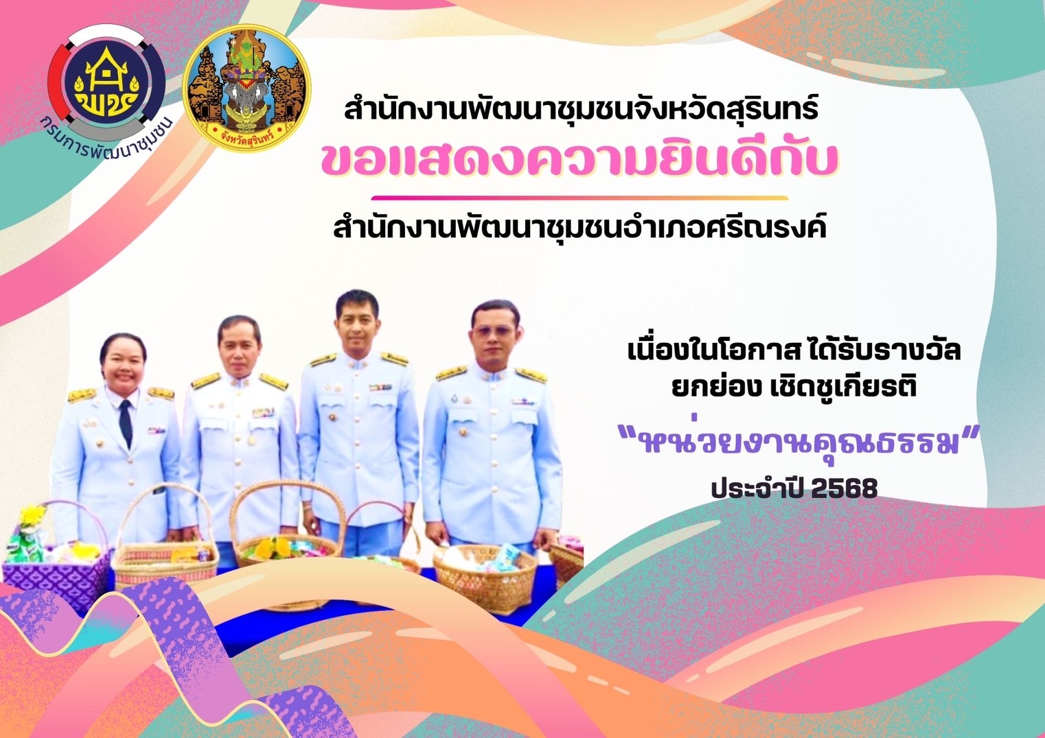 สำนักงานพัฒนาชุมชนจังหวัดสุรินทร์ ขอแสดงความชื่นชมและยินดีกับหน่วยงานคุณธรรม และบุคคลคุณธรรม ในการขับเคลื่อนองค์กรคุณธรรมเป้าหมาย “พอเพียง วินัย สุจริต จิตอาสา กตัญญู ประจำปี พ.ศ.2568